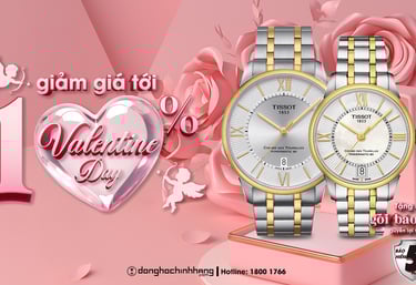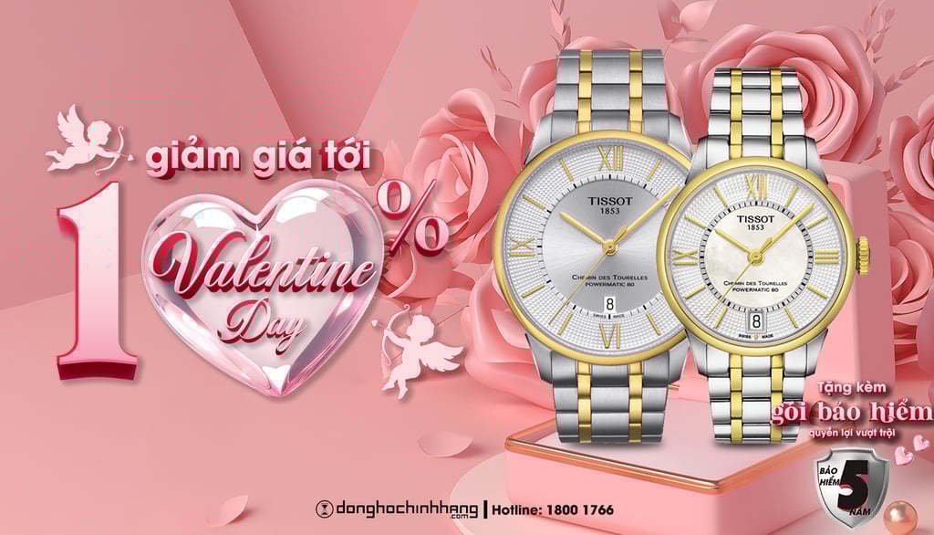 Tại donghochinhhang.com, từ 10/02 đến 14/02/2026, bạn không chỉ được giảm ngay 10% khi mua đồng hồ Tissot, mà còn được tặng thêm 2% ưu đãi khi chọn mua đồng hồ theo cặp.